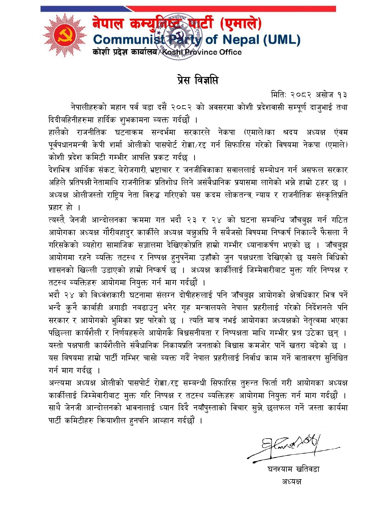 विज्ञप्तिमा नेकपा (एमाले)का अध्यक्ष तथा पूर्वपधानमन्त्री केपी शर्मा ओलीको पासपोर्ट रोक्का÷रद्द गर्न सिफारिस गरेको विषयप्रति गम्भीर आपत्ति प्रकट गरिएको छ । विज्ञप्तिमा भनिएको छ,‘ देशभित्र आर्थिक संकट, बेरोजगारी, भ्रष्टाचार र जनजीविकाका सवाललाई सम्बोधन गर्न असफल सरकार अहिले प्रतिपक्षी नेतामाथि राजनीतिक प्रतिशोध लिने असंवैधानिक प्रयासमा लागेको भन्ने हाम्रो ठहर छ । अध्यक्ष ओलीजस्तो राष्ट्रिय नेता विरुद्ध गरिएको यस कदम लोकतन्त्र, न्याय र राजनीतिक संस्कृतिप्रति प्रहार हो ।’