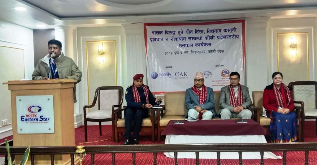 विराटनगर ६ पुस । विश्वभर हरेक सात बालक मध्ये एक बालक १८ वर्ष हुनु अघि नै यौन हिंसाबाट प्रभावित हुने गरेको पछिल्लो अध्ययनले देखाएको छ । नेपालमा पनि बालक विरुद्ध हुने हिंसा बर्षेनी बढ्दै गएको पाईएको छ ।
