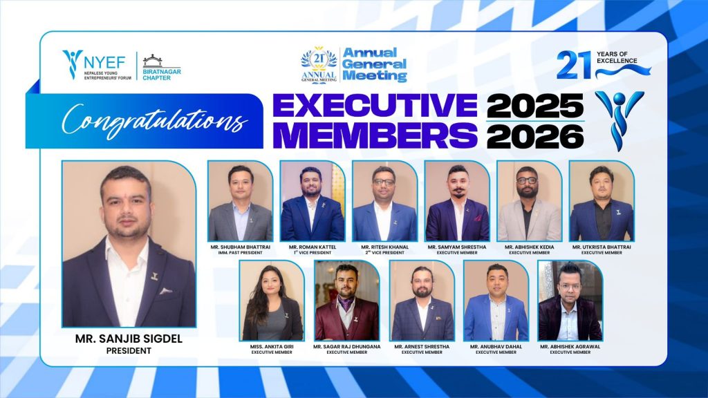 विराटनगर १ असार । नेपाल युवा उद्यमी मञ्च (NYEF) विराटनगर च्याप्टरको अध्यक्षमा सञ्जीव सिग्देल चयन हुनुभएको छ । शुक्रबार साँझ सम्पन्न २१ औं अधिवेशनले सिग्देलसहित सिङ्गो कार्यसमिति निर्विरोध चयन गरेको हो ।