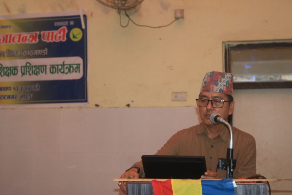 प्रशिक्षक प्रशिक्षण कार्यक्रममा राप्रपाका उपाध्यक्ष ध्रुवबहादुर प्रधान, केन्द्रीय सदस्य डा राजेश गिरी र सह प्रवक्ता दिनेश शाहले धार्मिक स्वतन्त्रत सहितको हिन्दू राष्ट्र स्थापित गर्ने पार्टीको एजेण्डालाई स्थापित गराउन निर्वाचनमा उम्मेदवारहरुलाई अध्याधिक स्थानमा विजयी गराउन आग्रह गर्नुभयो । सो अवसरमा उपाध्यक्ष प्रधानले स्थानीय तह निर्वाचनको नतिजा र सङ्घीय र प्रदेश सभा निर्वाचन रणनीति, केन्द्रीय सदस्य डा गिरीले राप्रपाको मूल सिद्धान्त, वैचारिक दर्शन, सांगठनिक स्वरुप एवं भावि कार्ययोजना, जयवहादुर श्रेष्ठले साम्यवाद, समाजवादी, पूँजीवाद र उदारवाद, हुपेन्द्र भण्डारीले हिन्दु धर्म र राजसंस्था र भक्ति सिटौलाले व्यवहारिक राजनीति विषयक कार्यपत्र प्रस्तुत गर्नु भएको थियो ।
