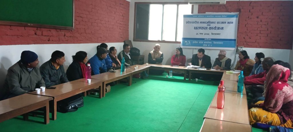 मानव अधिकार सञ्जालले आर्थिक, सामाजिक, सांस्कृतिक अधिकार भित्रका शिक्षा, स्वास्थ्य, खाध्य आवास र वातावरण अधिकार सहित विभेदका विषयलाई प्रदेश स्तरीय सरोकारवालाहरु समक्ष पुर्याउने र जिम्मेवारवालालाई जवाफदेही बनाउन निगरानी र खवरदारी गर्ने उद्देश्य रहेको सचिव सोमराज थापाले जानकारी दिनुभयो ।