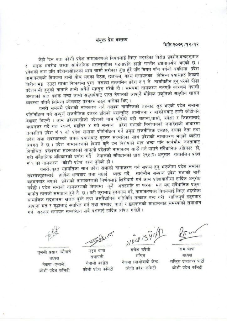 प्रदेश नामाकरणको विषय कुनै दल विशेषको मात्र भन्दा पनि सार्वभौम जनताबाट निर्वाचित प्रदेशसभा सदस्यहरूको आफ्नो प्रदेशको नामाकरण आफै गर्न पाउने संवैधानिक अधिकार हो, यही संवैधानिक अधिकारको प्रयोग गर्दै नेपालको संविधानको धारा २९५ (२) अनुसार तत्कालीन प्रदेश नं १ को नामकरण ‘कोशी प्रदेश’ रहन पुगेको हो,’ दलहरूले विज्ञप्तिमा भनेका छन्, यसरी वृहत सहमतिका साथ प्रदेश सभाको नामाकरण गर्न सफल हुनु भएकोमा प्रदेश सभाका सदस्यज्यूहरूलाई हार्दिक धन्यवाद तथा बधाई व्यक्त गर्दै सार्वभौम सम्पन्न प्रदेश सभाको भारी बहुमतबाट भएको प्रदेशको नामाकरणको निर्णयलाई शिरोधार्य गर्न आम प्रदेशवासीमा हार्दिक अनुरोध गर्दछौँ ।