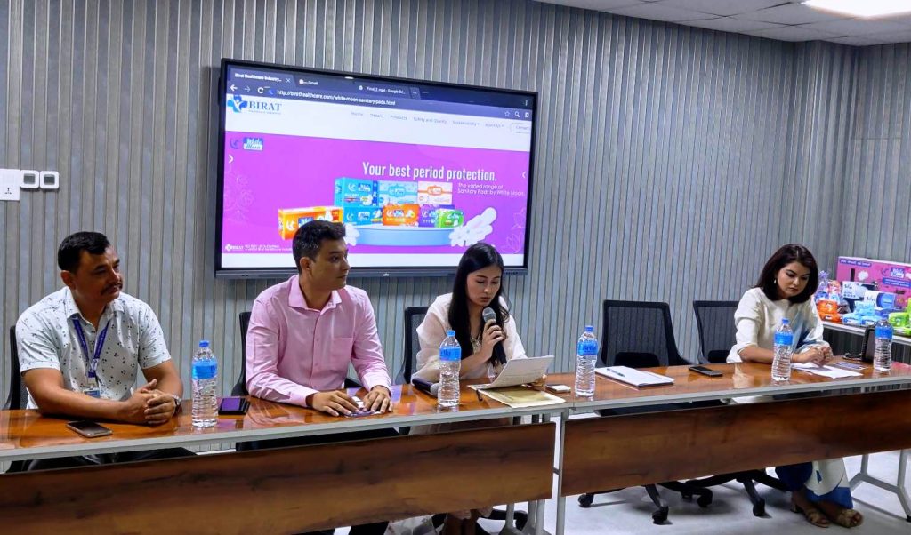 इन्डष्ट्रिजले शुक्रबार पत्रकार सम्मेलनको आयोजना गरेर विराट हेल्थ केयर इन्डष्ट्रिजले ‘ह्वाइट मुन’ नामक सेनिटरी प्याड उत्पादन गरेर बजारमा ल्याएको जानकारी गराएको हो । काममा सुरक्षा र स्वास्थ्यका लागि विश्व दिवसका अवसरमा इन्डष्ट्रिजले ‘ह्वाइट मुन’ को उत्पादन शुरु गरिएको जानकारी दिएको हो । इन्डष्ट्रिजले उत्पादन गरेको सेनिटरी प्याड विश्वसनिय र सुरक्षित रहेको दावी गरेको छ । आयातित सेनेटेरी सामानहरुमा परनिर्भरता घटाउनु मुख्य उद्देश्य रहेको प्रवन्ध निर्देशक छत्रबहादुर खड्काले जानकारी दिनुभयो ।