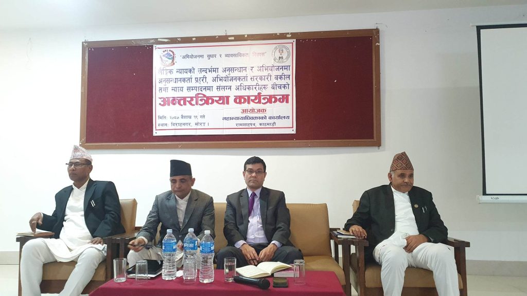 नायव महान्यायाधिवक्ता डा. टेकबहादुर घिमिरेको अध्यक्षतामा आयोजित कार्यक्रममा अपराधको अनुसन्धान, अभियोजन र न्याय निरुपणमा देखिएका समस्यालगायतका विषयमा पनि गहन छलफल भएको थियो । सरोकारवाला निकायले न्यायलाई केन्द्रमा राखेर आआफ्नो ठाउँबाट काम गर्ने प्रतिवद्धता पनि जनाएका छन् । पछिल्लो समय न्याय निरुपणमा विभिन्न समस्या देखिएको भन्दै समाधानका लागि एकअर्काबीच समन्वयको प्रतिवद्धता पनि जनाइएको छ । कोसी प्रदेशका मुख्य न्यायाधिवक्ता गजेन्द्र आचार्यले साक्षी बकपत्रको व्यवस्थापन सहज ढंगले हुन नसकिरहेको बताउनुभयो । उच्च अदालत विराटनगरका मुख्य न्यायाधीश सत्यमोहन जोशी थारुले सरकार वादी हुने कुनै उजुरी वा जाहेरी तत्काल दर्ता गरेर अनुसन्धानकर्ताले अनुसन्धान अघि बढाउनुपर्ने बताउनुभयो ।