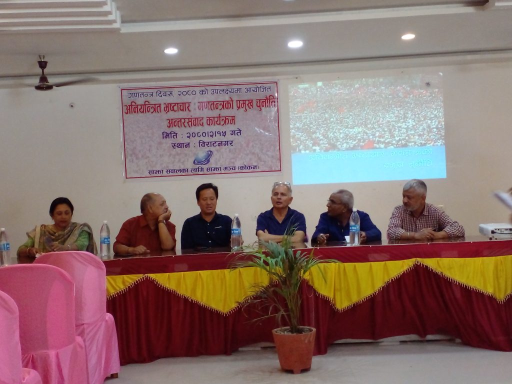 विराटनगर १६ जेठ । समाजको भ्रष्टाचारमुखी मानसिकताले नेपालमा भ्रष्टाचार मौलाइरहेको एक कार्यक्रमका सहभागिहरूले बताएका छन् । सोमबार विराटनगरमा साझा सवालका लागि साझा मञ्च कोकनले गणतन्त्र दिवसका अवसरमा आयोजना गरेको अनियन्त्रित भ्रष्टाचार गणतन्त्रको मुख्य चुनौति विषयक अन्तरसम्बाद कार्यक्रममा सहभागिहरूले यस्तो बताएका हुन् ।