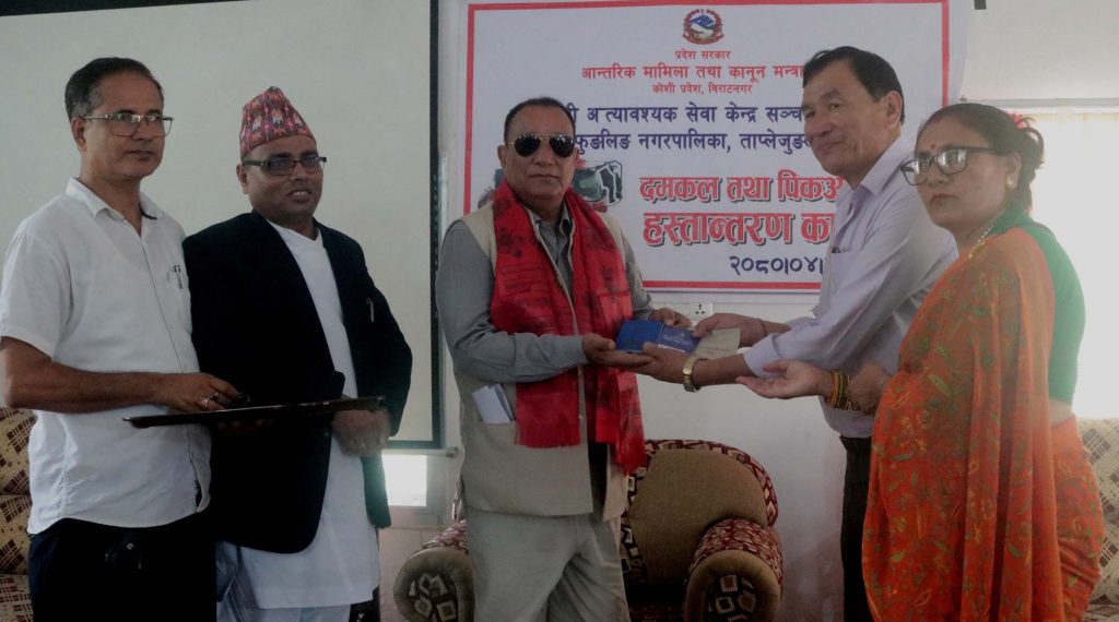 कार्यक्रममा आन्तरिक मामिला तथा कानून सचिव सुरेश राउतले विपद् व्यवस्थापन मन्त्रालयले योजनावद्ध काम गरिरहेको चर्चा गर्नुभयो । सो अवसरमा ताप्लेजुङ जिल्लाका फुङ्लिङ नगरपालिकाका प्रमुख अमीर मादेन र उपप्रमुख भीमादेवी ओझालाई एक थान दमकल र एक थान पिकअप भ्यान मुख्यमन्त्री थापाले हस्तान्तरण गर्नुभयो । दमकलको मूल्य रु ७७ लाख ५० हजार र पिकअप भ्यानको मूल्य रु ३७ लाख ५० हजार रहेको बताइएको छ ।