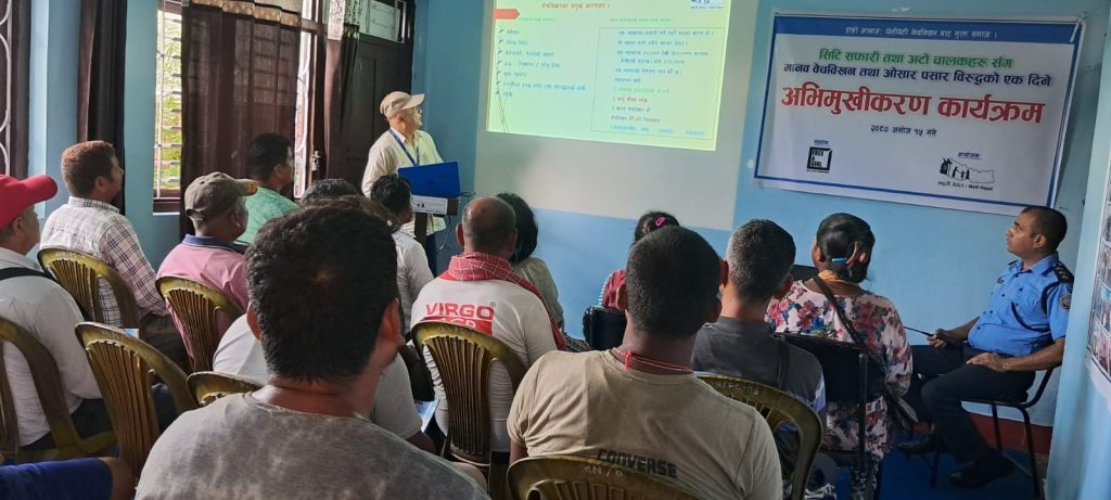 विराटनगर १५ असोज । विराटनगर सीमा क्षेत्रमा सञ्चालित सफारी र अटो चालकहरुसँग माईती नेपालले आज मानव वेचखिन तथा ओसार पसार विरुद्ध अभिमुखिकरण गरेको छ ।