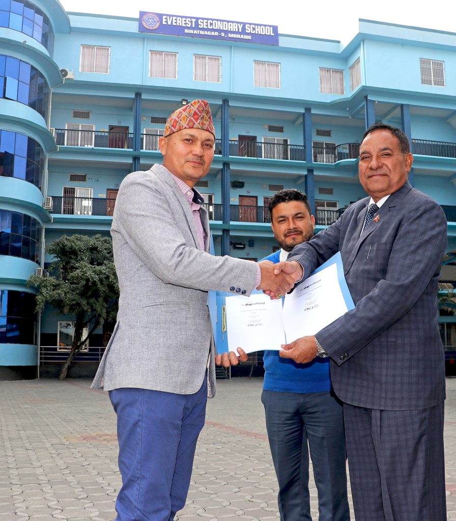 यूकेको एनसीसी सर्टिफाइड (प्रमाणित) डिजी स्कुलको कोर्षलाई आउँदो शैक्षिकसत्रबाट अध्ययापन सुरु गर्न एभरेष्ट स्कुलले सम्झौता गरेको हो । फागुन ७ गते एभरेष्ट कार्निभलको दौरान घोषणा गर्नुभएका प्रिन्सिपल पुरीले तीन दिन भित्रै सहकार्य गर्न पाउँदा खुसी लागेको बताउनुभएको छ । विश्वस्तरीय शिक्षा प्रदान गर्ने लक्ष्यका साथ अघि बढेको एभरेष्टका लागि कम्प्यूटर प्रविधि सिकाउने विश्वकै प्रतिष्ठित संस्थासँगको सहकार्यबाट यहाँका विद्यार्थीहरु समेत लाभान्वित हुने उहाँले विश्वास ब्यक्त गर्नुभयो । सम्झौतापत्रमा आज डिजी स्कुल नेपालका सिईओ राजु बानियाँ र एभरेष्ट स्कुलका प्रिन्सिपल टिकाराम पुरीले हस्ताक्षर गर्नुभएको छ ।