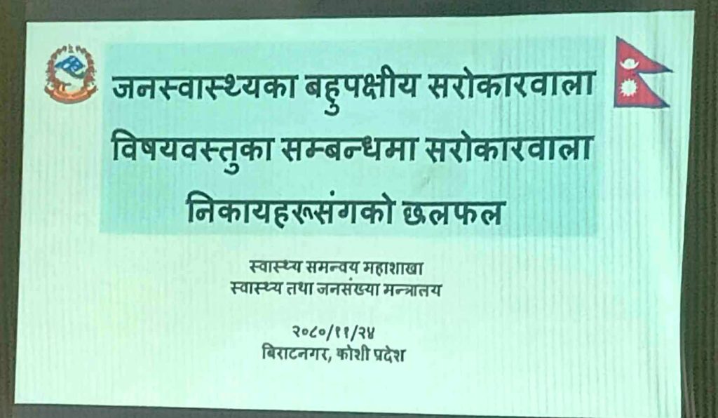 विराटनगरमा आयोजना गरिएको जनस्वास्थ्यको बहुपक्षिय सवाल विषयक अन्तक्रिर्या कार्यक्रममा बोल्दै स्वास्थ्य तथा जनसंख्या मन्त्रालयका सचिव डा.रोशन पोखरेलले पालिकामा १५ बेडको अस्पताल खोलेर विशेषज्ञ सेवा दिनै नसकिने कुरा जनप्रतिनिधिहरुले बुझ्नुपर्ने बताउनुभयो । उहाँले आइसियु संचालन गर्नको लागि २५ या ५० बेडको अस्पताल हुनु पर्ने जानकारी गराउनुभयो । उहाँले जनस्वास्थ्यको समस्या एकातिर र चाहना अर्र्काेतिर हुँदा पनि स्वास्थ्य सेवा प्रभावकारी हुन नसकेको बताउनुभयो । उहाँले ५४ सालको ओएण्डएम लिएर काम गर्न नसकिने धारणा राख्नुभयो । उहाँले नेपाल सरकारले ल्याएको स्वास्थ्य विमा कार्यक्रम व्यवस्थित नभए पनि सरकारी अस्पतालमा जानेको संख्या बढेको बताउनुभयो ।
