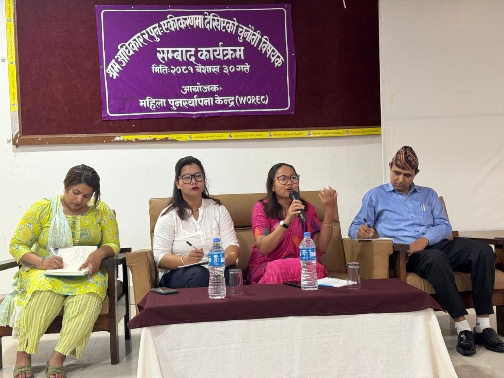 आज विराटनगरमा ओरेक नेपालले आयोजना गरेको श्रम अधिकार र पुनः एकिकरणमा देखिएको चुनौती विषयक अन्तक्रिर्या कार्यक्रममा वोल्दै सहभागिहरुले विदेशमा घरेलु कामदारका रुपमा काम गरेर आर्थिक रुपमा केही सम्पन्नता आएपनि समाज र व्यक्तिको नजर परिवर्तन नहुँदा समस्या भोग्नुपरेको बताएका छन । उनिहरुले आधुनिक युगमा पनि महिलाहरु माथि हेर्ने दृष्टिकोणमा परिवर्तन हुन नसक्दा समाजमा पुनस्र्थापना गर्न गाह्रो भईरहेको बताउनुभयो ।