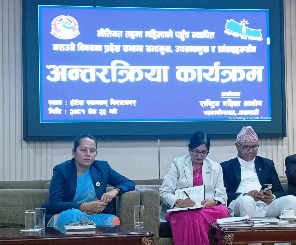 राष्ट्रिय महिला आयोगले महिलाको नीतिगत तहमा पहुँच स्थापित गराउन प्रदेश सभाका सभामुख, उपसभामुख र प्रदेश सांसदहरुको अन्तक्रिर्या कार्यक्रम आयोजना गरेको हो । महिला आयोगकी सदस्य कृष्णकुमारी पौडेर खतिवडाले अहिलेको महिलाहरुको आवश्यक्ताका वारेमा चर्चा गरेकी थिइन । उनले महिलाहरुको समस्या र गर्ने पर्ने विषयमा महिला आयोगले के के गर्नुपर्ने हो त्यो वारेमा कुरा उठाउनु पर्ने धारणा राखीन ।