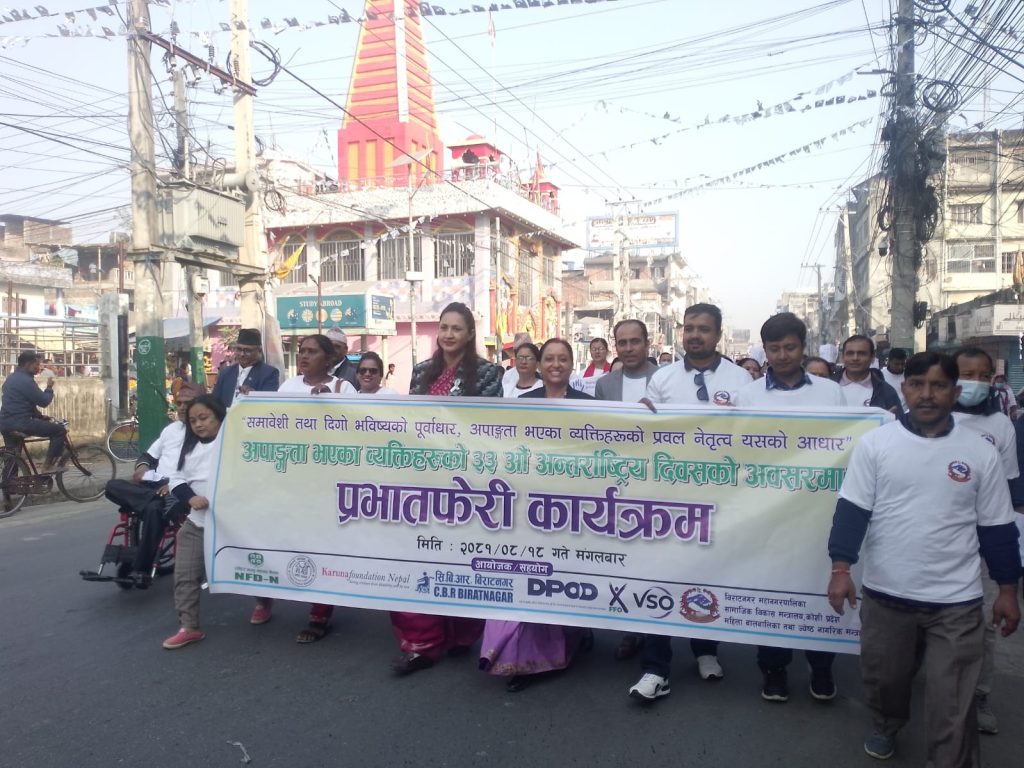 विराटनगर महानगरपालिका, राष्ट्रिय अपाङ्ग महासंघ, करुणा फाउन्डेसन नेपाल, सिविआर लगायतका संस्थाहरुको अगुवाईमा विराटनगर महानगरपालिका परिसरबाट प्रभातफेरि निकालिएको हो ।