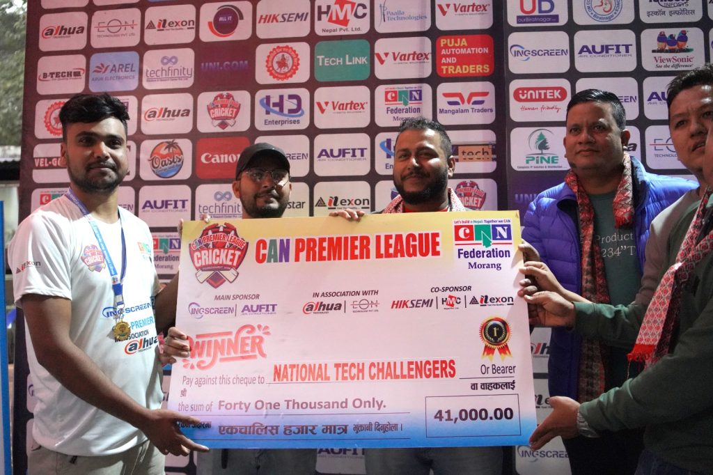विराटनगर २८ पुस । कम्प्युटर एसोसिएसन नेपाल महासंघ (क्यान) मोरङको आयोजनामा भएको आईएनजी स्क्रीन र एयुएफआईटी क्यान प्रिमियर लिग २०२५ क्रिकेट प्रतियोगितामा नेशनल टेक च्यालेन्जर्सले उपाधि जितेको छ ।