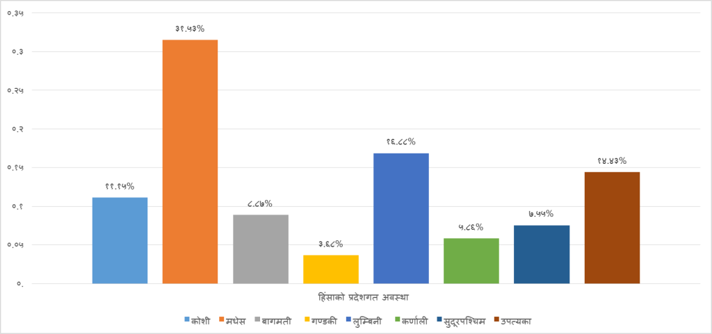देशभर भएका २ हजार ४४५ वटा घटनाहरु मध्ये लुम्बिनीमा १६.८८, कोशीमा ११.१५, बाग्मतीमा ८. ८७ , काठमाण्डौं उपत्यकामा मात्रै १४ दशमलव ४३, सुदरपश्चिममा ७.५५, कर्णालीमा ५.८६ र गण्डकीमा ३,६८ प्रतिशत हिंसाका घटना भएका छन् ।