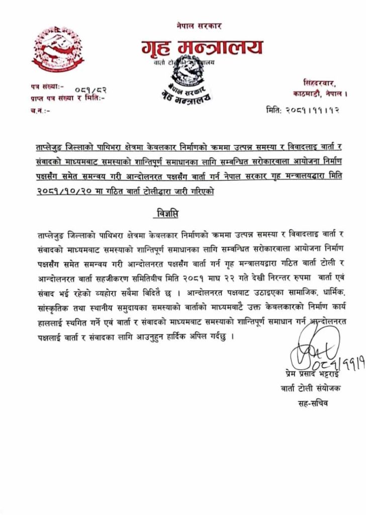 सरकारले गठन गरेको वार्ता टोलीका संयोजक गृहमन्त्रालयका सह–सचिव प्रेमप्रसाद भट्टराईले सोमबार एक सूचना जारी गरी आन्दोलनरत पक्षलाई वार्तामा बोलाएका हुन्। ‘आन्दोलनरत पक्षबाट उठाइएका सामाजिक, धार्मिक, सांस्कृतिक तथा स्थानीय समुदायका समस्याको वार्ताबाटै उक्त केबुलकारको निर्माण कार्य हाललाई स्थगित गर्ने’, विज्ञप्तिमा भनिएको छ, ‘वार्ता र संवादको माध्यमबाट समस्याको शान्तिपूर्ण समाधान गर्न आन्दोलनरत पक्षलाई वार्ता र संवादका लागि आउन अनुरोध गर्दछु ।’