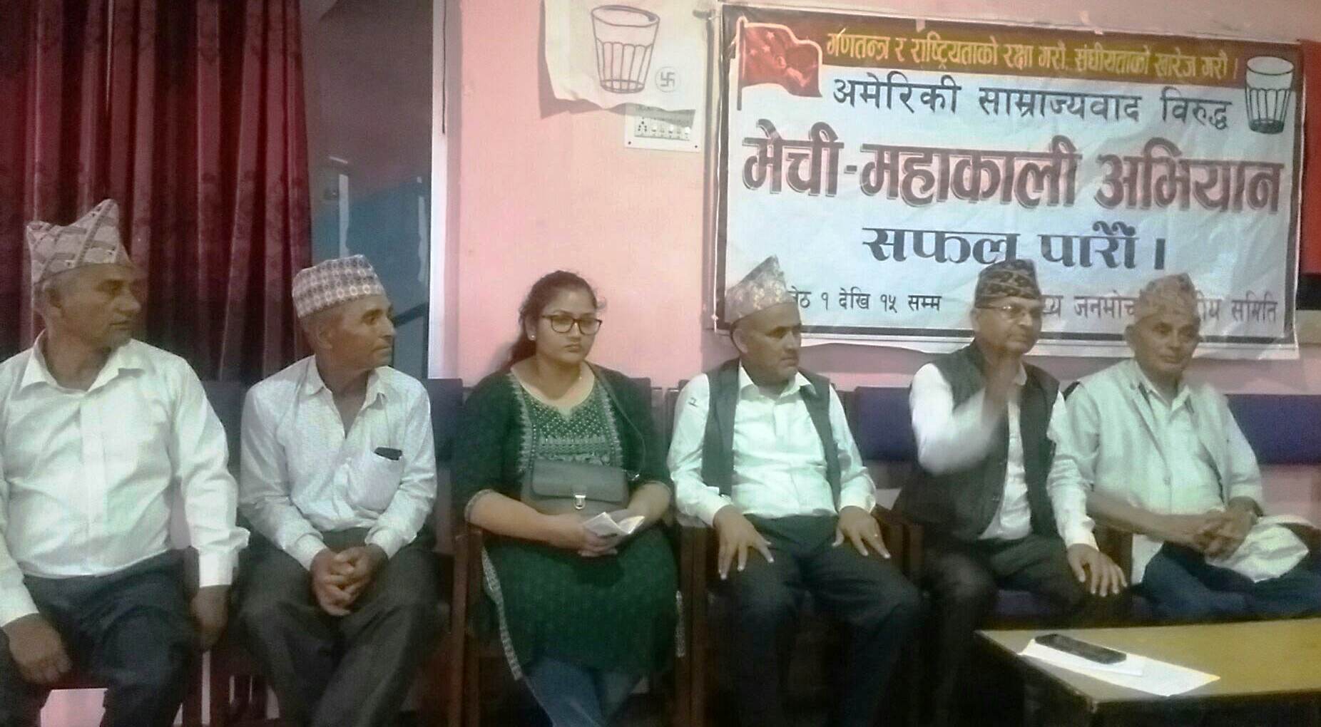 विराटनगर ९ जेठ । राष्ट्रिय जनमोर्चाले अमेरिकी साम्राज्यवाद विरुद्ध मेची– महाकाली अभियान शुरुवात गरेको छ । जेठ १ गते देखि शुरु भएको अभियान अन्र्तगत आज विराटनगरमा पत्रकार सम्मेलन गरि अभियानबारे जानकारी गराईएको छ । नेपालमा दिनप्रतिदिन अमेरिकी साम्राज्यवादको प्रभाव र प्रभुत्व बढ्दै गएको भन्दै राष्ट्रिय जनमोर्चा यस विरुद्ध मेची–महाकाली अभियान शुरु गरेको केन्द्रीय सचिव हिमलाल […]