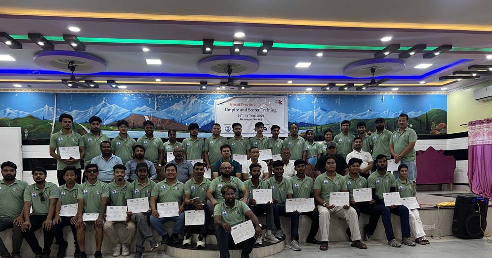 विराटनगर १९ जेठ । नेपाल क्रिकेट संघको आयोजनामा विराटनगरमा सञ्चालित तीन दिने ‘जिराे’ लेभल अम्पायर तथा स्कोरर तालिम सम्पन्न भएको छ । जेठ १५ देखि १७ गतेसम्म सञ्चालन भएको तालिममा कोशी प्रदेशका ११ वटा जिल्लाबाट ३५ जना सहभागी भएका थिए । सहभागीहरूमा धनकुटा, संखुवासभा, मोरङ, सुनसरी, ओखलढुंगा, उदयपुर, खोटाङ, झापा, ताप्लेजुङ, पाँचथर र भोजपुर जिल्लाका […]