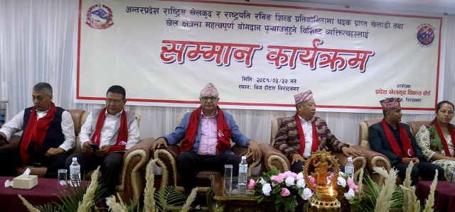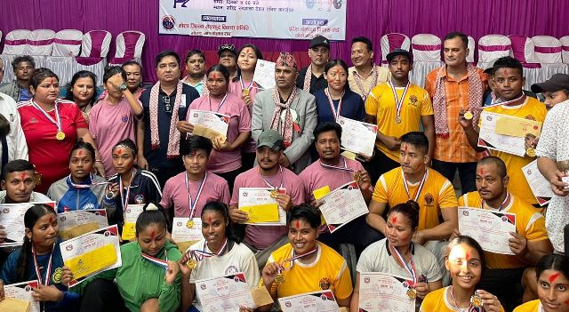 विराटनगर २९ असार । कोशी प्रदेश खेलकुद विकास बोर्डले प्रदेशका दुई सय जना खेलाडी, प्रशिक्षक र व्यवस्थापकलाई सम्मान एवं पुरस्कृत गर्ने भएको छ । बोर्डद्वारा आज विराटनगरमा आयोजित पत्रकार सम्मेलनमा भोली आईतबार अन्तरप्रदेश राष्ट्रिय खेलकुद प्रतियेगिता र १४ औं केन्द्रीय राष्ट्रपति रनिङ शिल्ड प्रतियोगितामा पदक प्राप्त खेलाडी, सम्बन्धित खेलका प्रशिक्षक र व्यवस्थापकलाई नगद सहित सम्मान […]