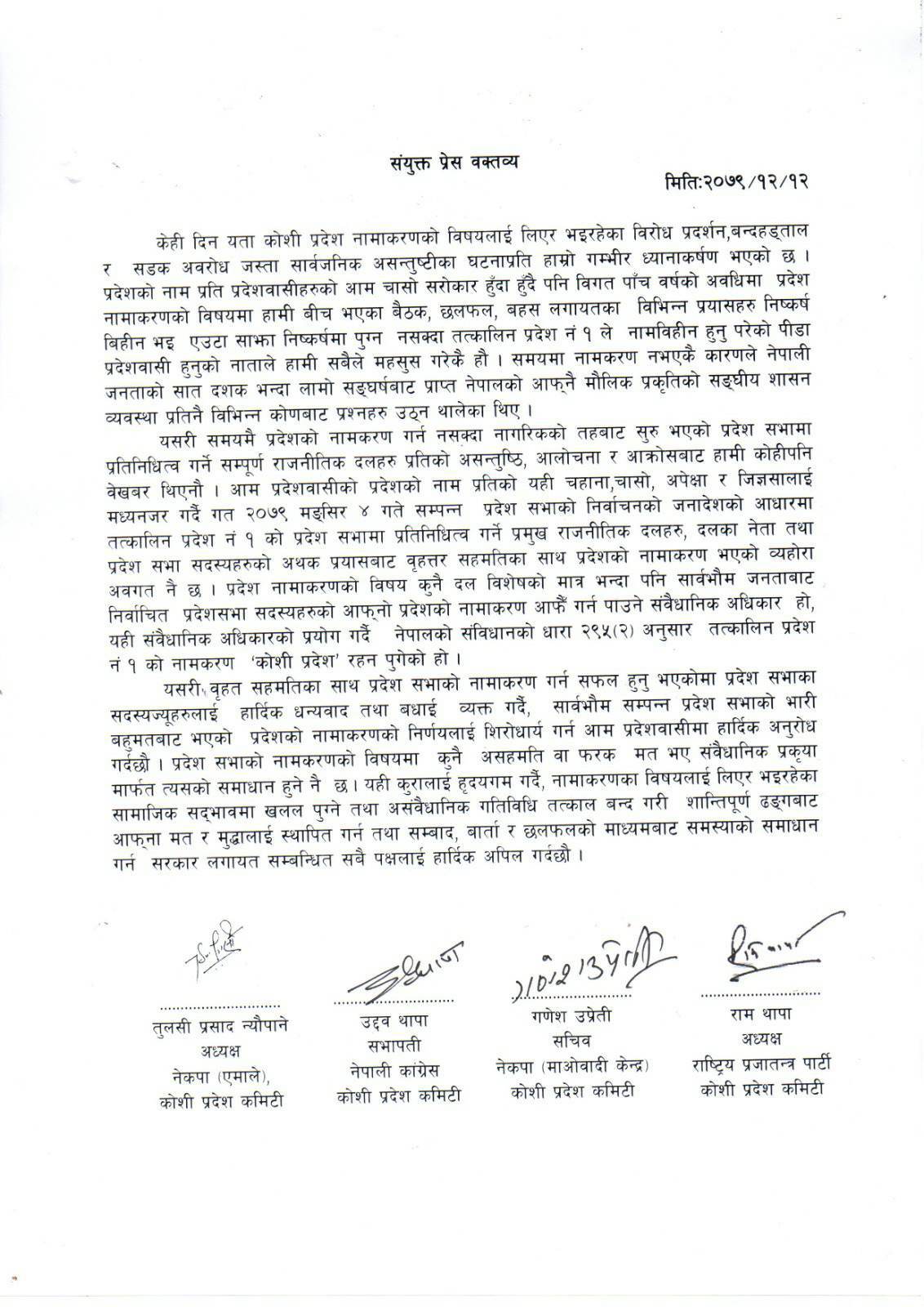 कर्षण विराटनगर १२ चैत । कोशी प्रदेशका राजनीतिक दलहरूले केही दिन यता कोशी प्रदेश नामाकरणको विषयलाई लिएर भइरहेका विरोध प्रदर्शन, बन्दहड्ताल र सडक अवरोध जस्ता सार्वजनिक असन्तुष्टिका घटनाप्रति गम्भीर ध्यानाकर्षण भएको बताएका छन् । आइतबार एक प्रेस विज्ञप्ति जारी गर्दै प्रदेशको नाम प्रति प्रदेशवासीहरूको आम चासो सरोकार हुँदा हुँदै पनि विगत पाँच वर्षको अवधिमा प्रदेश […]