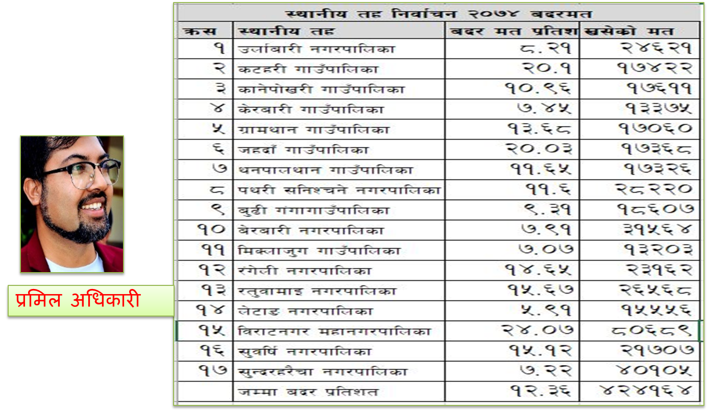 विसं २०७४को स्थानीय तहको चुनावमा विराटनगर महानगरपालिकमा ५७१० को मतान्तरमा नेपली कांग्रेसका भीम पराजुलीले एमालेका विनोदप्रसाद ढकाललाई पराजय गरेको थिए । मतगणनाको क्रममा करिब १९,४१९ (२४.७ प्रतिशत) मत बदर भएको पाइयो । मतदाता शिक्षालाई प्रभावकारी बताएको निर्वाचन आयोग र दलले उक्त बदरमत विराटनगरमा अउनु आश्चार्यजनक थियो । क्रमशः जहदाँ गाउँपालिकामा २० प्रतिशत, रतुवामाईमा २० प्रतिशत […]