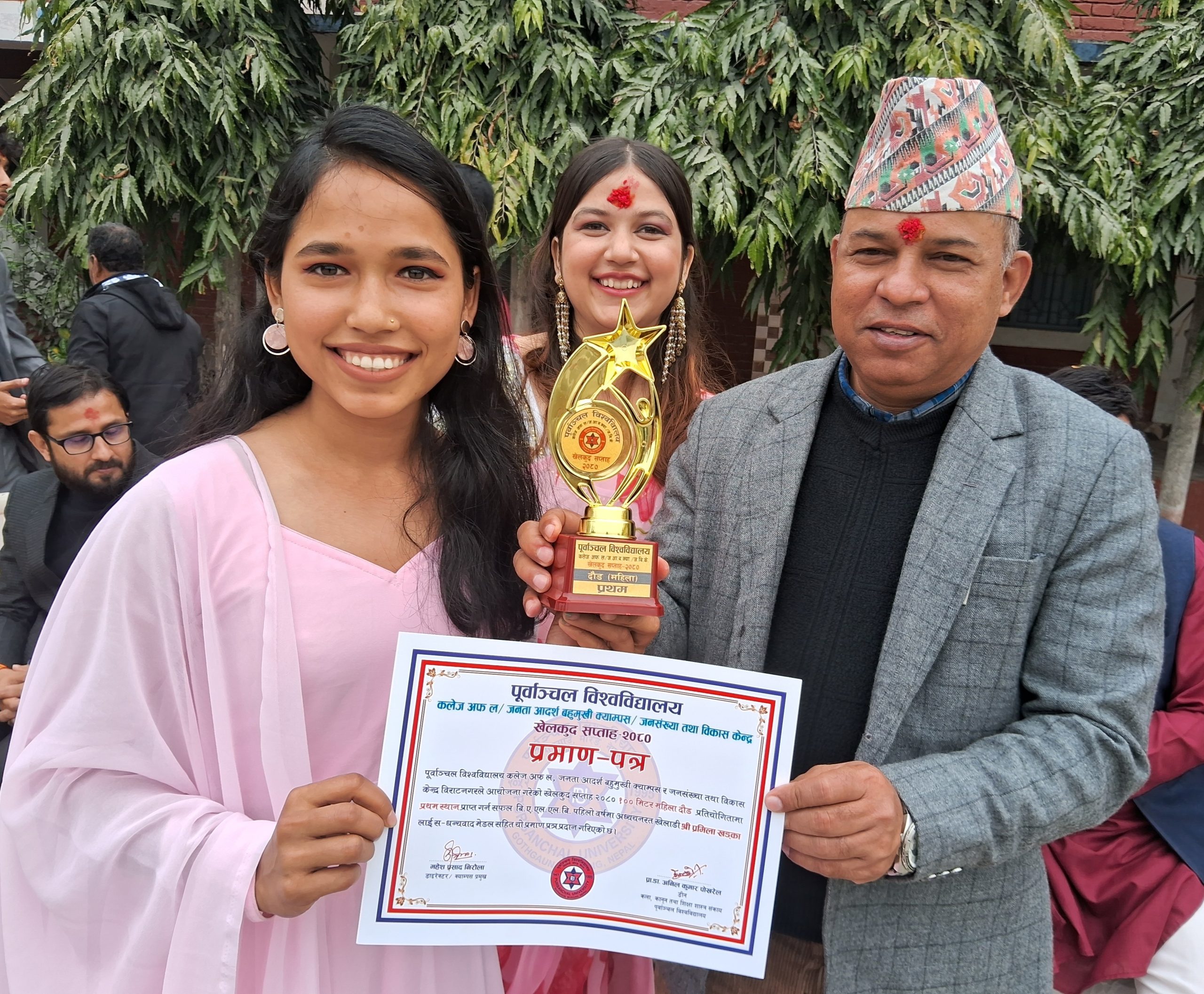 विराटनगर ३ फागुन । विश्वविद्यालयको वार्षिकोत्सवका अवसरमा आयोजित खेलकुद सप्ताहमा विजयी विद्यार्थीहरूलाई बुधवार मेडल, ट्रफी तथा प्रमाणपत्र वितरण गरिएको छ । विजयी विद्यार्थीहरूलाई कला, शिक्षा तथा कानुन शंकायका डीन प्रा. डा. अनिल कुमार पोखरेल, क्याम्पस प्रमुख महेश प्रसाद निरौला लगायतले एक कार्यक्रमकाबीच मेडल, ट्रफी र प्रमाण पत्र वितरण गर्नुभएको हो । एक सय मिटर महिला […]