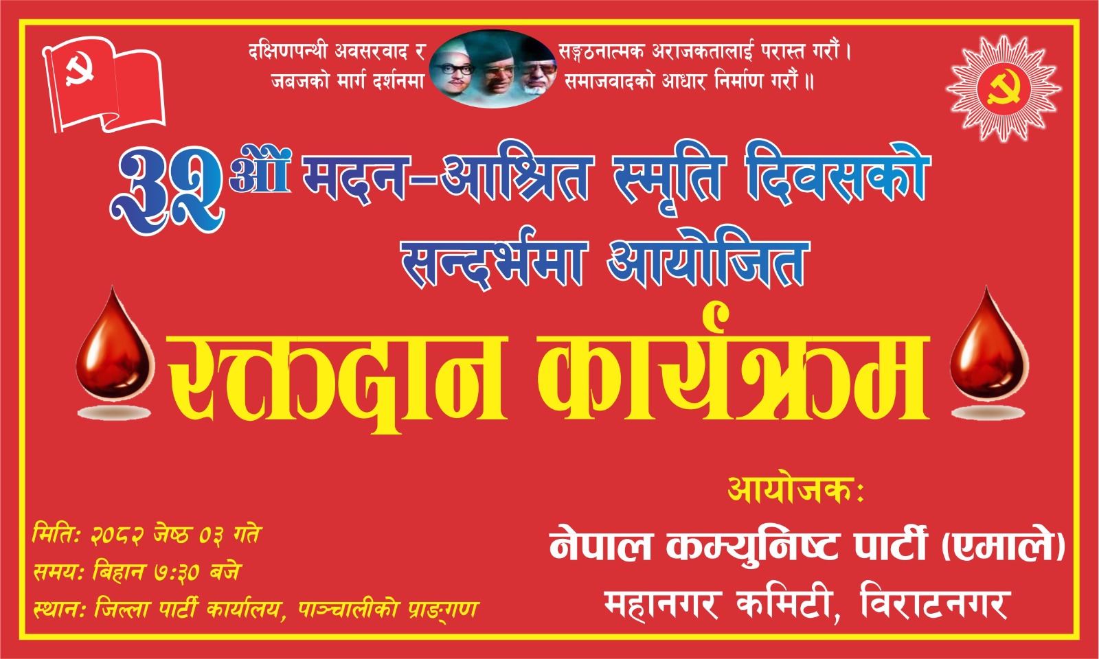 विराटनगर २ जेठ । नेकपा एमाले विराटनगर महानगर कमिटीले रक्तदान कार्यक्रम गर्ने भएकाे छ । तत्कालीन पार्टी महासचिव मदन भण्डारी र संगठन विभाग प्रमुख जीवराज आश्रितकाे ३२ औं स्मृति दिवसकाे अवसरमा रक्तदान कार्यक्रम गर्न लागिएको महानगर कमिटी सचिव विज्ञान शर्माले जानकारी दिनुभयाे । जिल्ला पार्टी कार्यालय पाञ्चालीमा जेठ ३ गते शनिबार विहान साढे ७ वजेदेखि […]